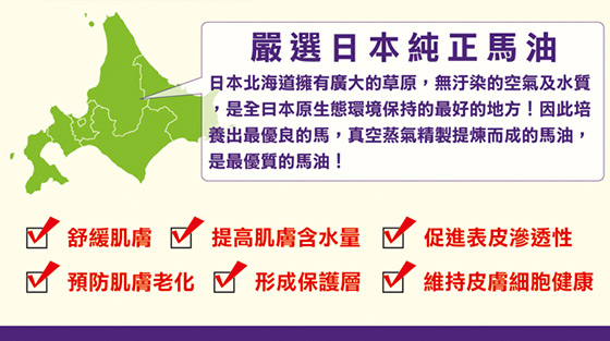 嚴選北海道優質馬油,24小時深層保濕並修護肌膚。