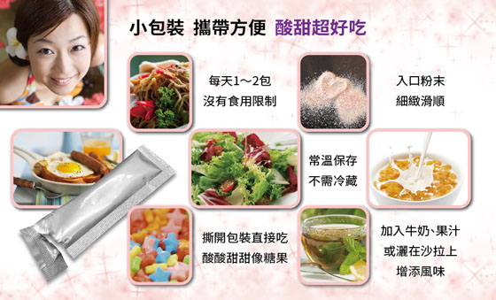 成分:膠原蛋白、赤蘚糖醇、蔓越莓果汁粉、果寡糖、葡萄糖、巴西莓萃取物、麥芽糊精、Lactobacillus salivarius、Bifidobacterium breve、Lactobacillus plantarum、Lactobacillus acidophilus、Lactobacillus acidophilus